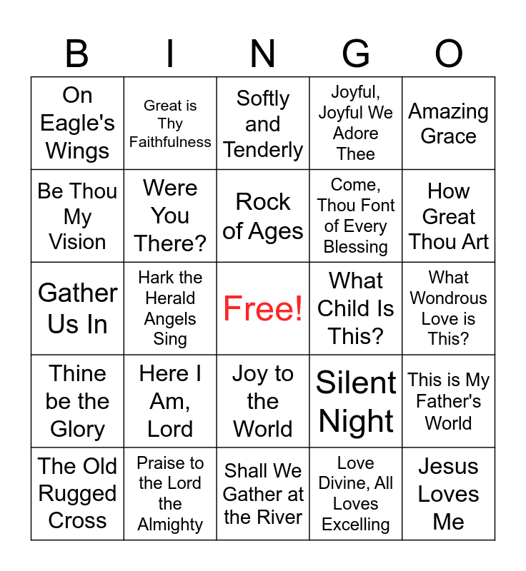 This bingo card has a free space and 24 words: Here I Am, Lord, Praise to the Lord the Almighty, Rock of Ages, The Old Rugged Cross, Amazing Grace, On Eagle's Wings, Be Thou My Vision, Great is Thy Faithfulness, What Child Is This?, Joy to the World, Come, Thou Font of Every Blessing, Gather Us In, Silent Night, This is My Father's World, Were You There?, Love Divine, All Loves Excelling, What Wondrous Love is This?, Softly and Tenderly, How Great Thou Art, Hark the Herald Angels Sing, Jesus Loves Me, Thine be the Glory, Joyful, Joyful We Adore Thee and Shall We Gather at the River.