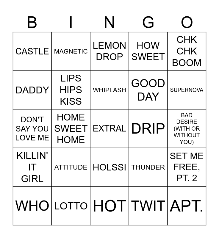 This bingo card has 36 words: IF I SAY, I LOVE YOU, LIKE JENNIE, MONA LISA, LIPS HIPS KISS, THUNDER, KILLIN' IT GIRL, WHIPLASH, CRAZY, CHK CHK BOOM, TOO BAD, HOME SWEET HOME, HOW SWEET, REBEL HEART, DRIP, SUPERNOVA, CASTLE, APT., ATTITUDE, EXTRAL, LEMON DROP, BAD DESIRE (WITH OR WITHOUT YOU), SET ME FREE, PT. 2, LOTTO, WHO, HOT, MAGNETIC, DON'T SAY YOU LOVE ME, I AM, GOOD DAY, DADDY, WHO U ARE, POOKIE, TWIT, HOLSSI, TELL ME and TEMPO.