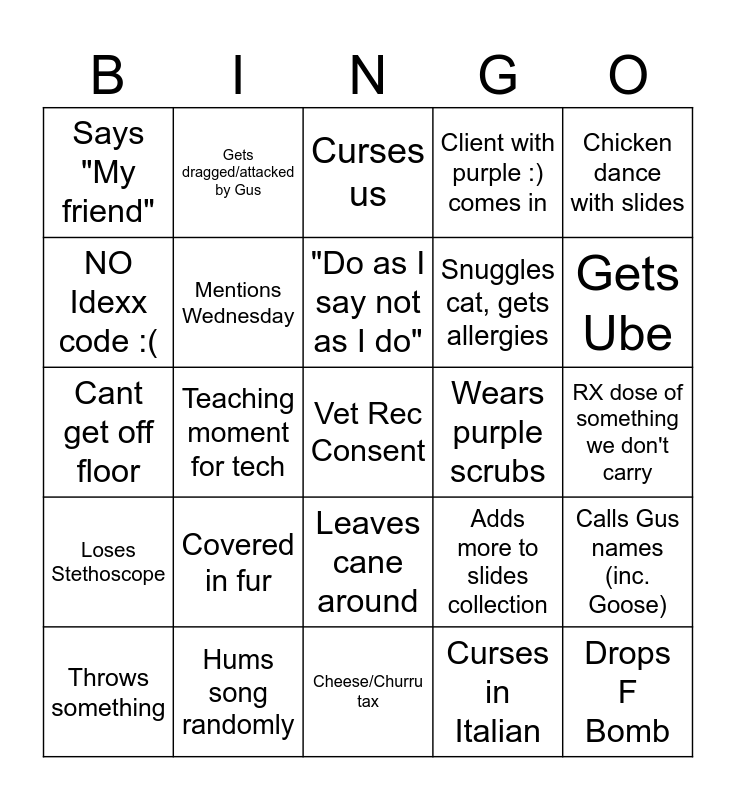 This bingo card has a free space and 24 words: Covered in fur, Hums song randomly, "Do as I say not as I do", Throws something, Chicken dance with slides, Says "My friend", NO Idexx code :(, Gets dragged/attacked by Gus, Wears purple scrubs, Leaves cane around, Snuggles cat, gets allergies, Cant get off floor, Adds more to slides collection, Calls Gus names (inc. Goose), Mentions Wednesday, Curses in Italian, RX dose of something we don't carry, Curses us, Gets Ube, Teaching moment for tech, Drops F Bomb, Loses Stethoscope, Client with purple :) comes in and Cheese/Churru tax.