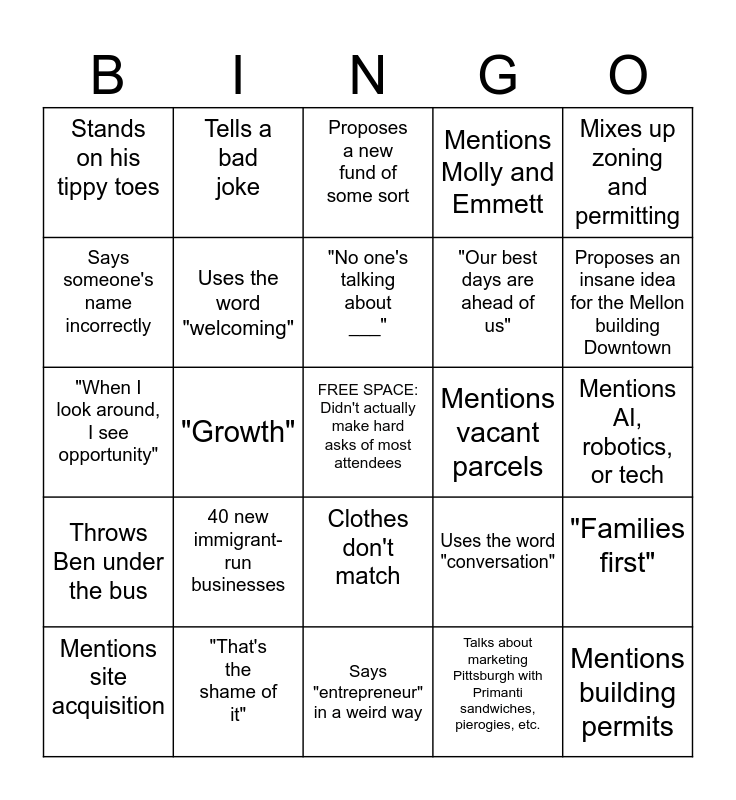 This bingo card has a free space and 24 words: 40 new immigrant-run businesses, "That's the shame of it", "No one's talking about ___", Mentions site acquisition, Mixes up zoning and permitting, Stands on his tippy toes, Says someone's name incorrectly, Tells a bad joke, Mentions vacant parcels, Clothes don't match, "Our best days are ahead of us", "When I look around, I see opportunity", Uses the word "conversation", "Families first", Uses the word "welcoming", Talks about marketing Pittsburgh with Primanti sandwiches, pierogies, etc., Mentions AI, robotics, or tech, Proposes a new fund of some sort, Proposes an insane idea for the Mellon building Downtown, "Growth", Mentions building permits, Throws Ben under the bus, Mentions Molly and Emmett and Says "entrepreneur" in a weird way.