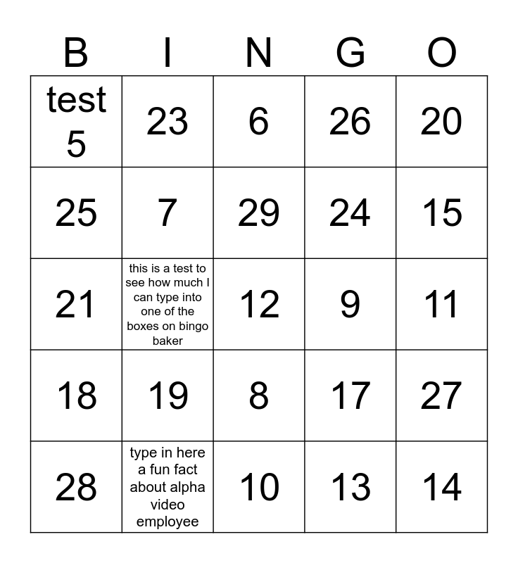 This bingo card has 30 words: type in here a fun fact about alpha video employee, I met my wife in Iowa, this is a test to see how much I can type into one of the boxes on bingo baker, test 4, test 5, 6, 7, 8, 9, 10, 11, 12, 13, 14, 15, 16, 17, 18, 19, 20, 21, 22, 23, 24, 25, 26, 27, 28, 29 and 30.
