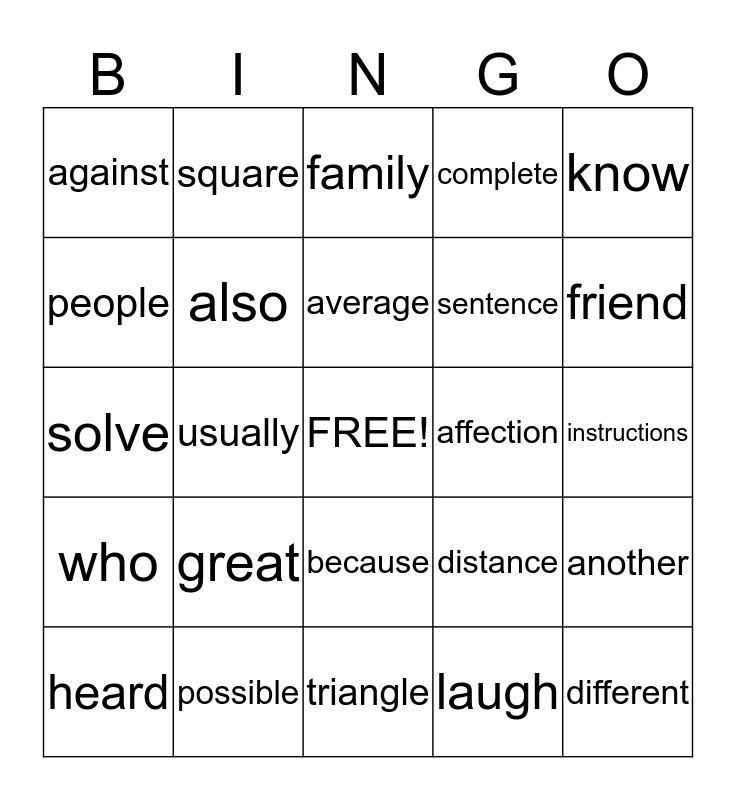 This bingo card has a free space and 24 words: great, possible, average, heard, know, against, people, square, affection, because, sentence, solve, distance, another, also, laugh, instructions, family, friend, usually, different, who, complete and triangle.