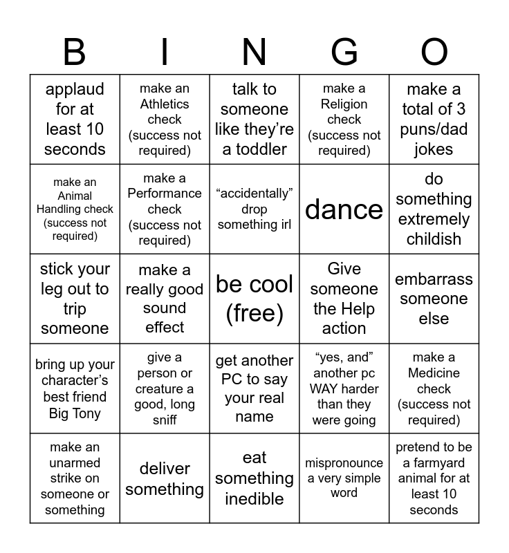 This bingo card has a free space and 47 words: get another player to compliment you, pretend to be a farmyard animal for at least 10 seconds, sell something, eat something inedible, give a person or creature a good, long sniff, break the fourth wall, make an Athletics check (success not required), make an Acrobatics check (success not required), make an Animal Handling check (success not required), make an Intimidation check (success not required), make a Performance check (success not required), make a Religion check (success not required), make a Medicine check (success not required), “yes, and” another pc WAY harder than they were going, ask another pc a question they didn’t prepare the answer to, use drugs, “accidentally” drop something irl, Give someone the Help action, explain how an ability looks in-universe, make a total of 3 puns/dad jokes, make a really good sound effect, mispronounce a very simple word, applaud for at least 10 seconds, dance, dm the dm something that makes them LOL out loud, do something extremely childish, make an unarmed strike on someone or something, play an instrument for someone, get another PC to say your real name, bring up your character’s best friend Big Tony, be on fire, receive a romantic gesture, become someone’s sworn enemy, take damage during a conversation, make a fart noise with your armpit, deliver something, embarrass someone else, slap your knee, roll with advantage, roll with disadvantage, mock someone to their face, talk to someone like they’re a toddler, stick your leg out to trip someone, stop a crime, commit a crime, floss (either dance/hygiene) and uncover a secret.