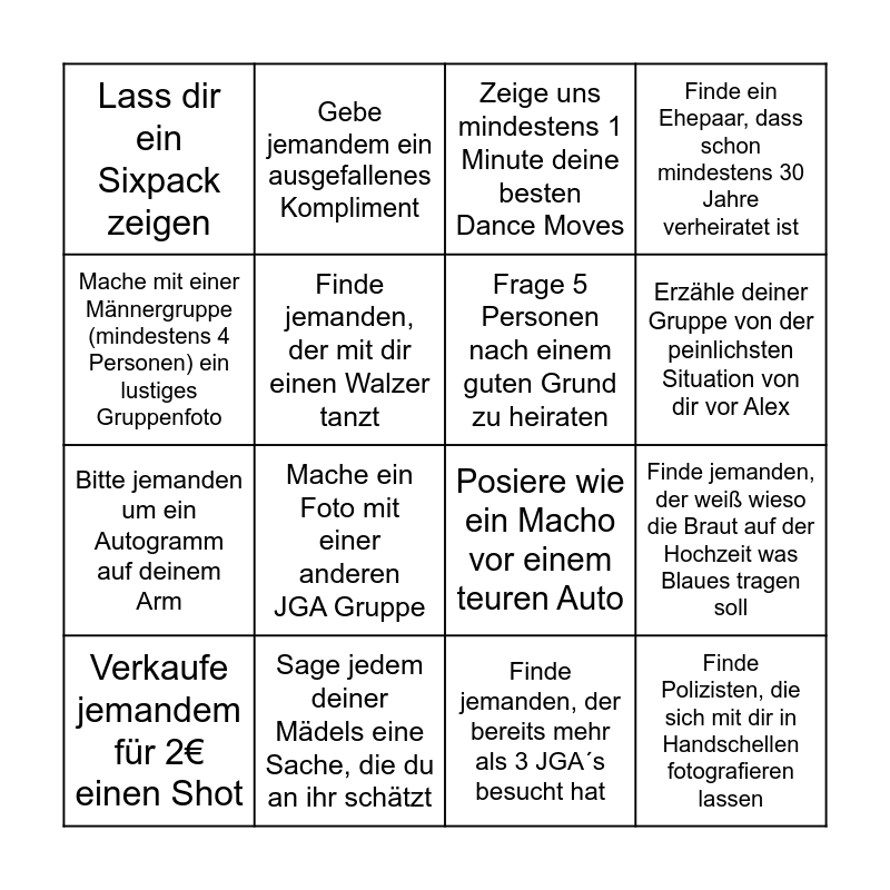 This bingo card has 16 words: Verkaufe jemandem für 2€ einen Shot, Sage jedem deiner Mädels eine Sache, die du an ihr schätzt, Zeige uns mindestens 1 Minute deine besten Dance Moves, Finde ein Ehepaar, dass schon mindestens 30 Jahre verheiratet ist, Mache mit einer Männergruppe (mindestens 4 Personen) ein lustiges Gruppenfoto, Gebe jemandem ein ausgefallenes Kompliment, Posiere wie ein Macho vor einem teuren Auto, Finde jemanden, der weiß wieso die Braut auf der Hochzeit was Blaues tragen soll, Lass dir ein Sixpack zeigen, Finde jemanden, der mit dir einen Walzer tanzt, Finde jemanden, der bereits mehr als 3 JGA´s besucht hat, Erzähle deiner Gruppe von der peinlichsten Situation von dir vor Alex, Bitte jemanden um ein Autogramm auf deinem Arm, Mache ein Foto mit einer anderen JGA Gruppe, Frage 5 Personen nach einem guten Grund zu heiraten and Finde Polizisten, die sich mit dir in Handschellen fotografieren lassen.