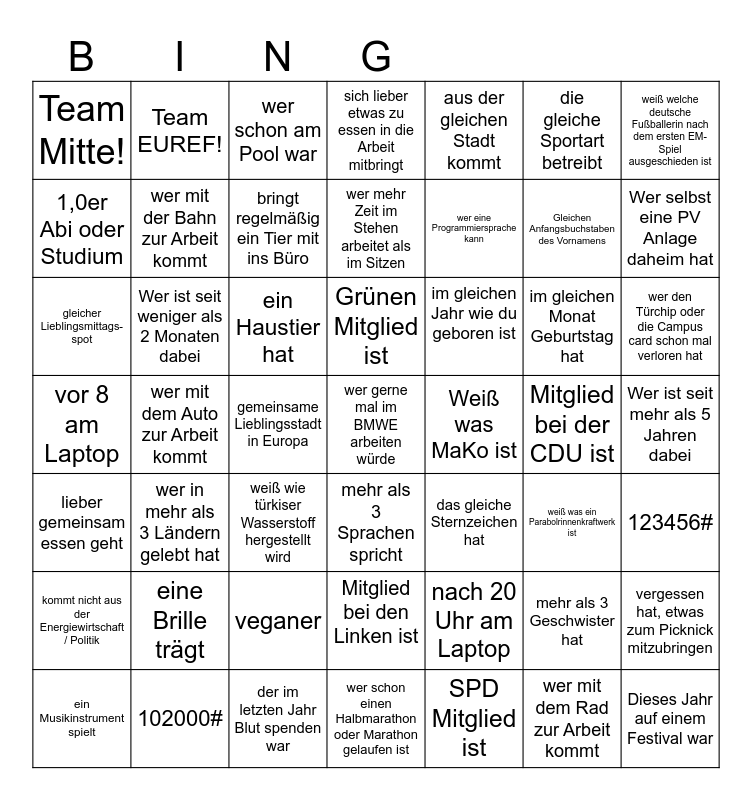 This bingo card has 49 words: mehr als 3 Geschwister hat, Gleichen Anfangsbuchstaben des Vornamens, SPD Mitglied ist, wer mit dem Auto zur Arbeit kommt, ein Haustier hat, Wer ist seit mehr als 5 Jahren dabei, Team EUREF!, der im letzten Jahr Blut spenden war, die gleiche Sportart betreibt, mehr als 3 Sprachen spricht, weiß welche deutsche Fußballerin nach dem ersten EM-Spiel ausgeschieden ist, sich lieber etwas zu essen in die Arbeit mitbringt, im gleichen Monat Geburtstag hat, im gleichen Jahr wie du geboren ist, eine Brille trägt, Mitglied bei der CDU ist, 1,0er Abi oder Studium, Wer selbst eine PV Anlage daheim hat, vergessen hat, etwas zum Picknick mitzubringen, aus der gleichen Stadt kommt, wer eine Programmiersprache kann, gemeinsame Lieblingsstadt in Europa, Team Mitte!, wer mit der Bahn zur Arbeit kommt, ein Musikinstrument spielt, bringt regelmäßig ein Tier mit ins Büro, wer den Türchip oder die Campus card schon mal verloren hat, 102000#, Grünen Mitglied ist, Wer ist seit weniger als 2 Monaten dabei, Dieses Jahr auf einem Festival war, Weiß was MaKo ist, kommt nicht aus der Energiewirtschaft / Politik, veganer, vor 8 am Laptop, das gleiche Sternzeichen hat, weiß was ein Parabolrinnenkraftwerk ist, 123456#, gleicher Lieblingsmittags-spot, weiß wie türkiser Wasserstoff hergestellt wird, Mitglied bei den Linken ist, lieber gemeinsam essen geht, wer gerne mal im BMWE arbeiten würde, wer schon einen Halbmarathon oder Marathon gelaufen ist, wer mehr Zeit im Stehen arbeitet als im Sitzen, wer schon am Pool war, nach 20 Uhr am Laptop, wer in mehr als 3 Ländern gelebt hat and wer mit dem Rad zur Arbeit kommt.