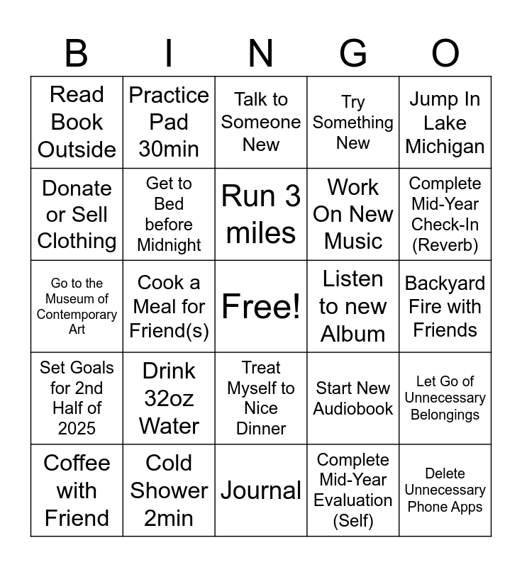 This bingo card has a free space and 24 words: Drink 32oz Water, Cold Shower 2min, Run 3 miles, Coffee with Friend, Jump In Lake Michigan, Read Book Outside, Donate or Sell Clothing, Practice Pad 30min, Listen to new Album, Treat Myself to Nice Dinner, Work On New Music, Go to the Museum of Contemporary Art, Start New Audiobook, Let Go of Unnecessary Belongings, Get to Bed before Midnight, Complete Mid-Year Evaluation (Self), Backyard Fire with Friends, Talk to Someone New, Complete Mid-Year Check-In (Reverb), Cook a Meal for Friend(s), Delete Unnecessary Phone Apps, Set Goals for 2nd Half of 2025, Try Something New and Journal.