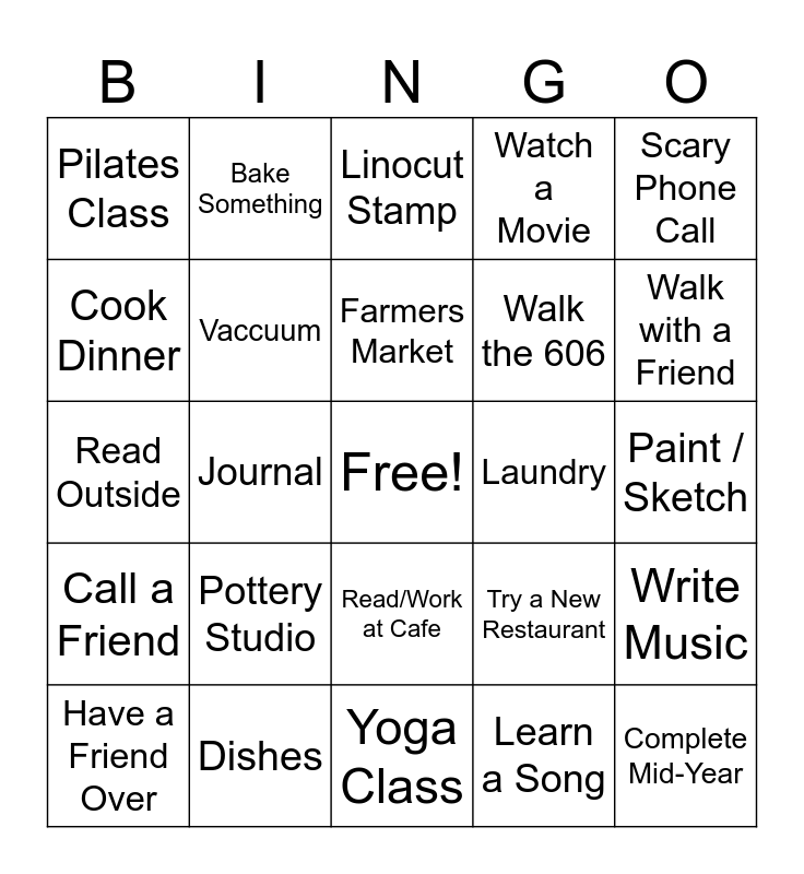 This bingo card has a free space and 24 words: Pottery Studio, Dishes, Farmers Market, Have a Friend Over, Scary Phone Call, Pilates Class, Cook Dinner, Bake Something, Laundry, Read/Work at Cafe, Walk the 606, Read Outside, Try a New Restaurant, Write Music, Vaccuum, Learn a Song, Paint / Sketch, Linocut Stamp, Walk with a Friend, Journal, Complete Mid-Year, Call a Friend, Watch a Movie and Yoga Class.