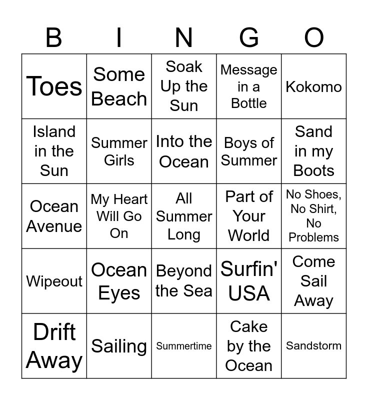 This bingo card has 26 words: Beyond the Sea, Cake by the Ocean, Into the Ocean, Sailing, Kokomo, Toes, Island in the Sun, Some Beach, No Shoes, No Shirt, No Problems, Surfin' USA, Boys of Summer, Ocean Avenue, Come Sail Away, Drift Away, My Heart Will Go On, The Tide is High, Message in a Bottle, Wipeout, Soak Up the Sun, All Summer Long, Sand in my Boots, Summertime, Part of Your World, Ocean Eyes, Summer Girls and Sandstorm.