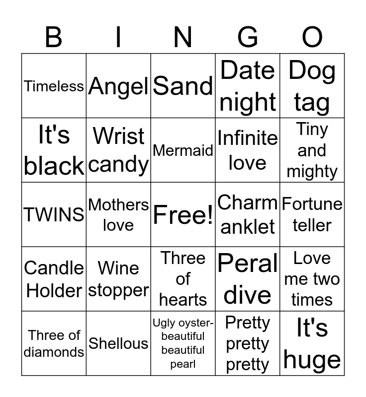 This bingo card has a free space and 26 words: Three of hearts, Pretty pretty pretty, Mermaid, Shellous, Dog tag, Timeless, It's black, Angel, Fortune teller, Peral dive, Infinite love, TWINS, Love me two times, Three of diamonds, Mothers love, Bangle, Date night, Candle Holder, Sand, It's huge, Tiny and mighty, Ugly oyster-beautiful beautiful pearl, Charm anklet, Wine stopper, Wrist candy and Feather in the wind ribbon of hope.