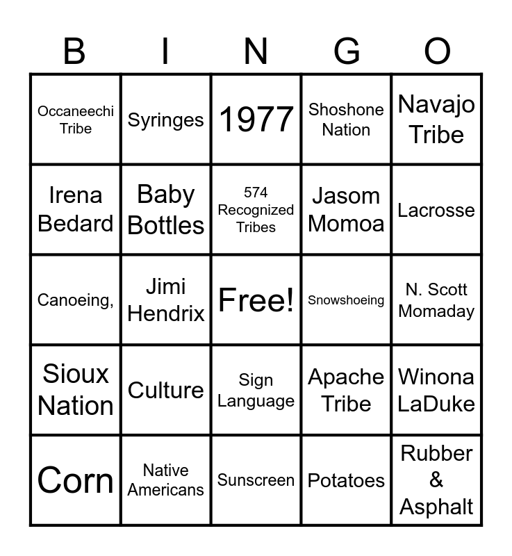 This bingo card has a free space and 24 words: Culture, Native Americans, 574 Recognized Tribes, Corn, Navajo Tribe, Occaneechi Tribe, Irena Bedard, Syringes, Snowshoeing, Sign Language, Jasom Momoa, Canoeing,, Apache Tribe, Winona LaDuke, Baby Bottles, Potatoes, N. Scott Momaday, 1977, Lacrosse, Jimi Hendrix, Rubber & Asphalt, Sioux Nation, Shoshone Nation and Sunscreen.