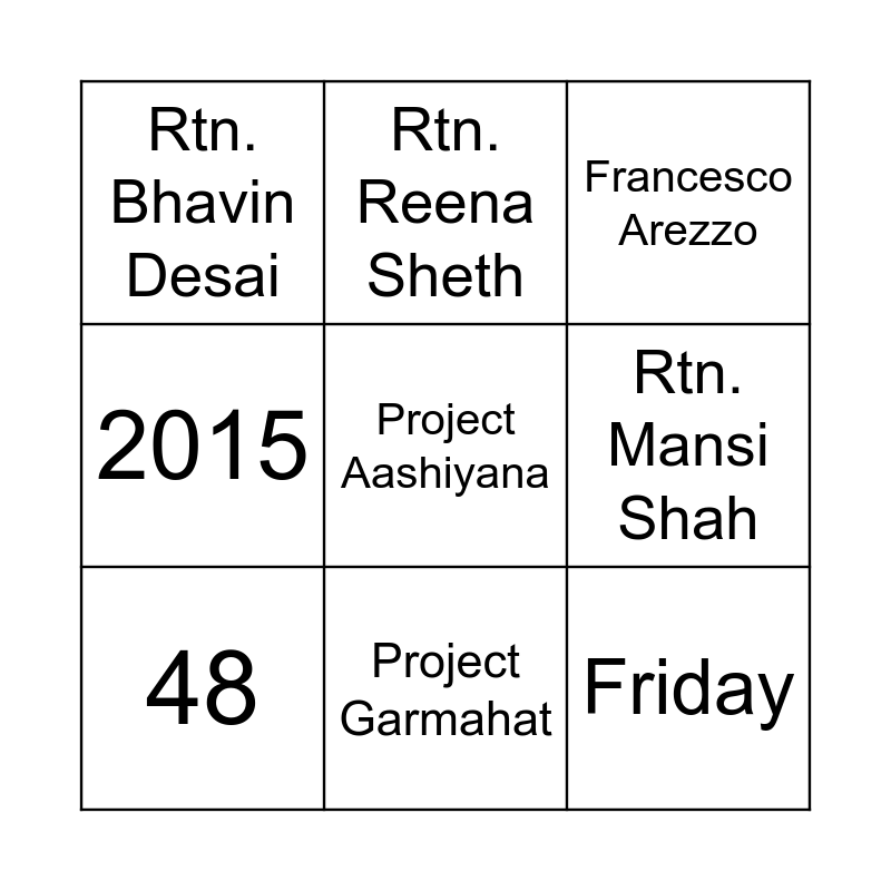 This bingo card has 25 words: 10 years, Rtn. Jignesh Pandya, Project Garmahat, Project Asmita, Project Aashiyana, Rtn. Bhavin Desai, Rtn. Mansi Shah, Rtn. Reena Sheth, 1st July, Paul Harris, Friday, Self, Asmita Next, Lake Town, 48, Rtn. Prachi Pandya, Rtn. Jignesh & Rtn. Prachi Pandya, Francesco Arezzo, Rtn. Santosh Marathe, 86417, 3131, Membership and Environment, Good, 2015 and Rtn. Yogita Vaisahmpayan.