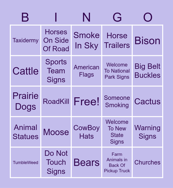 This bingo card has a free space and 33 words: Trump Signs, Religious Adds, CowBoy Hats, CowBoy Boots, Big Belt Buckles, Taxidermy, RoadKill, Dogs Hanging Out Car Windows, Horse Trailers, Pickup Trucks, Cattle, Horses On Side Of Road, LongHorns On Cars, Farm Animals in Back Of Pickup Truck, Bison, Prairie Dogs, Moose, Bears, Welcome To New State Signs, Cactus, TumbleWeed, Bodys Of Water, Smoke In Sky, Someone Smoking, Churches, Animal Statues, Sports Team Signs, American Flags, Welcome To National Park Signs, Warning Signs, Vanity Plates, Do Not Touch Signs and Fast Food.