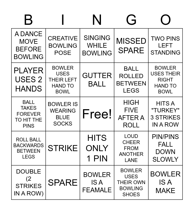 This bingo card has a free space and 24 words: STRIKE, SPARE, GUTTER BALL, DOUBLE (2 STRIKES IN A ROW), TWO PINS LEFT STANDING, A DANCE MOVE BEFORE BOWLING, PLAYER USES 2 HANDS, CREATIVE BOWLING POSE, HIGH FIVE AFTER A ROLL, HITS ONLY 1 PIN, BALL ROLLED BETWEEN LEGS, BALL TAKES FOREVER TO HIT THE PINS, LOUD CHEER FROM ANOTHER LANE, PIN/PINS FALL DOWN SLOWLY, BOWLER USES THEIR LEFT HAND TO BOWL, BOWLER USES THEIR OWN BOWLING SHOES, HITS A "TURKEY" 3 STRIKES IN A ROW, SINGING WHILE BOWLING, BOWLER USES THEIR RIGHT HAND TO BOWL, BOWLER IS WEARING BLUE SOCKS, BOWLER IS A MAKE, ROLL BALL BACKWARDS BETWEEN LEGS, MISSED SPARE and BOWLER IS A FEAMALE.