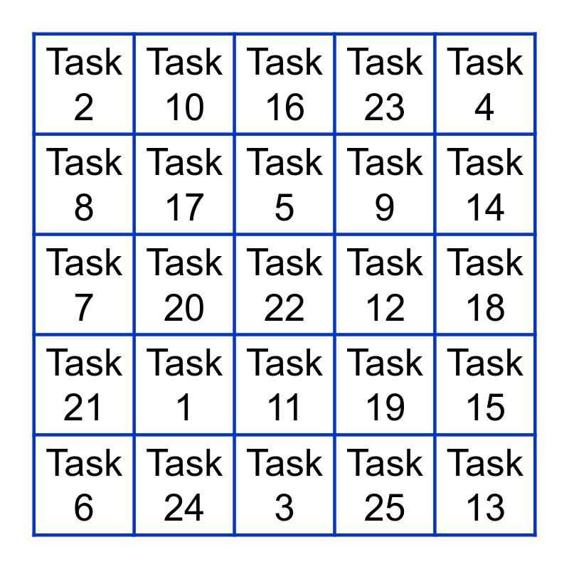 This bingo card has 25 words: Task 1, Task 3, Task 5, Task 6, Task 4, Task 2, Task 8, Task 10, Task 12, Task 11, Task 9, Task 7, Task 19, Task 15, Task 17, Task 13, Task 18, Task 16, Task 14, Task 20, Task 22, Task 24, Task 21, Task 23 and Task 25.