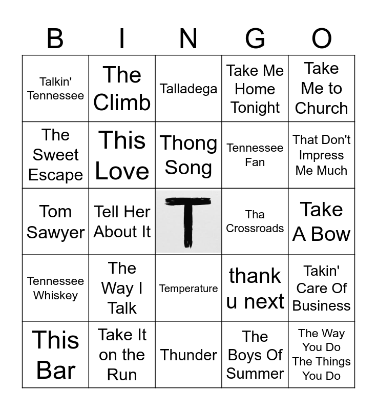 This bingo card has a free space and 69 words: Tainted Love, Take A Bow, Take A Chance On Me, Take It Easy, Take It on the Run, Take It to da House, Take Me Home Tonight, Take Me Home Country Roads, Take Me to Church, Take on Me, Takin' Care Of Business, Talk Dirty To Me, Talkin' Tennessee, Talladega, Teenage Dream, Tell Her About It, Temperature, Tennessee Fan, Tennessee Orange, Tennessee Whiskey, Tha Crossroads, thank u next, That Don't Impress Me Much, That's the Way (I Like It), The Bones, The Box, The Boy Is Mine, The Boys Are Back In Town, The Boys Of Summer, The Chain, The Climb, The Fireman, The Lazy Song, The Locomotion, The Night We Met, The Power Of Love, The Pretender, The Real Slim Shady, The Sweet Escape, The Twist, The Way I Talk, The Way You Do The Things You Do, The Way You Make Me Feel, Thinking out Loud, Thinkin’ Bout Me, This Bar, This Is How We Do It, This Is How We Roll, This Is Why I'm Hot, This Love, Thong Song, Thought You Should Know, Thuggish Ruggish Bone, Thunder, TiK ToK, Time After Time, Tiny Dancer, Tipsy, Toes, Tom Sawyer, Too Good At Goodbyes, Toxic, Training Season, TRUCK BED, Try That In A Small Town, Tubthumping, Turn Down for What, Twist And Shout and Two Pina Coladas.