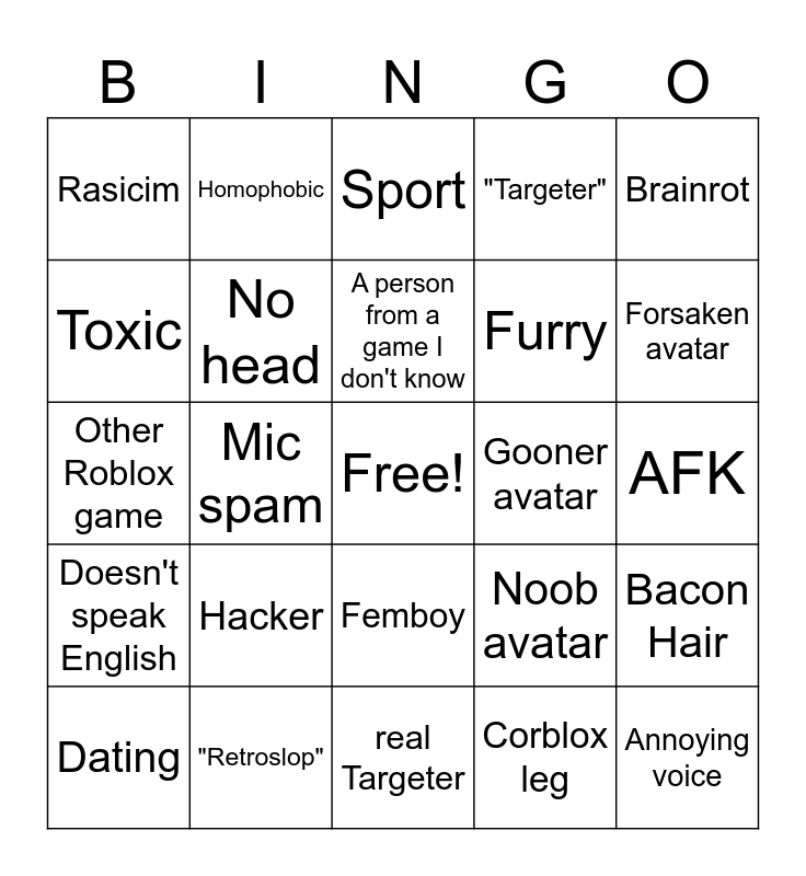 This bingo card has a free space and 24 words: Hacker, "Retroslop", A person from a game I don't know, Dating, Brainrot, Rasicim, Toxic, Homophobic, Gooner avatar, Femboy, Furry, Other Roblox game, Noob avatar, Bacon Hair, No head, Corblox leg, AFK, Sport, Forsaken avatar, Mic spam, Annoying voice, Doesn't speak English, "Targeter" and real Targeter.