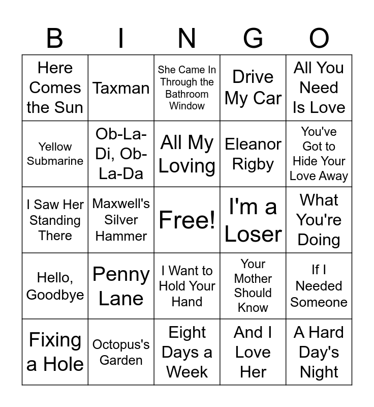 This bingo card has a free space and 30 words: Octopus's Garden, Come Together, Maxwell's Silver Hammer, Oh! Darling, Here Comes the Sun, She Came In Through the Bathroom Window, Ob-La-Di, Ob-La-Da, I Want to Hold Your Hand, I'm a Loser, Eight Days a Week, What You're Doing, A Hard Day's Night, And I Love Her, Can't Buy Me Love, You've Got to Hide Your Love Away, Magical Mystery Tour, Your Mother Should Know, Hello, Goodbye, Penny Lane, All You Need Is Love, I Saw Her Standing There, Love Me Do, Taxman, Eleanor Rigby, Yellow Submarine, Drive My Car, If I Needed Someone, Fixing a Hole, All My Loving and I Wanna Be Your Man.