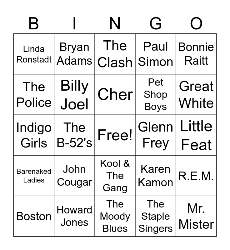 This bingo card has a free space and 33 words: Aerosmith, After the Fire, The B-52's, Bananarama, Barenaked Ladies, Billy Joel, Bonnie Raitt, Boston, Bryan Adams, Cheap Trick, Cher, The Clash, Duran Duran, Fine Young Cannibals, Glenn Frey, Great White, Howard Jones, Indigo Girls, John Cougar, Karen Kamon, Kool & The Gang, Level 42, Linda Ronstadt, Little Feat, The Moody Blues, Mr. Mister, Paul Simon, Pet Shop Boys, The Police, R.E.M., Rosanne Cash, The Staple Singers and Tears for Fears.