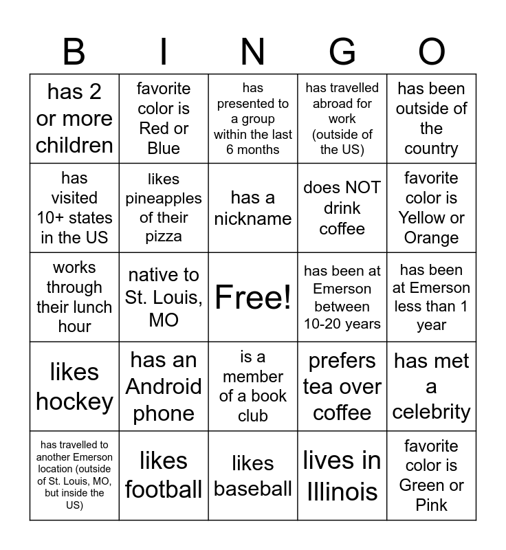 This bingo card has a free space and 51 words: graduated from a college NOT in Missouri, favorite color is Green or Pink, favorite color is Black or Purple, likes baseball, has an Android phone, graduated from a college in Missouri, favorite color is Red or Blue, has been at Emerson between 5-10 years, has visited 10+ states in the US, has a house phone, likes pineapples of their pizza, has travelled abroad for work (outside of the US), has met a celebrity, prefers tea over coffee, celebrating a birthday this month, speaks 2 or more languages (English included), has a nickname, has been at Emerson between 10-20 years, recycles, has been outside of the country, native to St. Louis, MO, lives in Illinois, has 2 or more children, does NOT drink coffee, sings karaoke, enjoys running/jogging, favorite color is Yellow or Orange, has a pet cat, has travelled to another Emerson location (outside of St. Louis, MO, but inside the US), has presented to a group within the last 6 months, has a Linked-In account, has cable TV, not originally from Missouri, has an Apple phone, played sports in high school, likes football, likes basketball, is wearing their Emerson badge, is wearing the color Black, has been at Emerson between 1-5 years, has been at Emerson less than 1 year, likes hockey, takes daily walks, has a pet dog, likes soccer, has taken more than 3 vacation days this year, works through their lunch hour, hangs out with co-workers outside of work, is left-handed, is a member of a book club and loves holiday decorating.