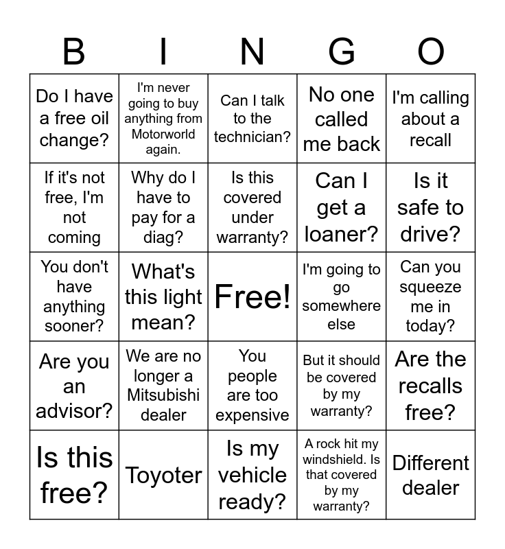 This bingo card has a free space and 24 words: We are no longer a Mitsubishi dealer, Toyoter, Is this covered under warranty?, Is this free?, I'm calling about a recall, Do I have a free oil change?, If it's not free, I'm not coming, I'm never going to buy anything from Motorworld again., I'm going to go somewhere else, You people are too expensive, Can I get a loaner?, You don't have anything sooner?, But it should be covered by my warranty?, Are the recalls free?, Why do I have to pay for a diag?, A rock hit my windshield. Is that covered by my warranty?, Can you squeeze me in today?, Can I talk to the technician?, Is it safe to drive?, What's this light mean?, Different dealer, Are you an advisor?, No one called me back and Is my vehicle ready?.