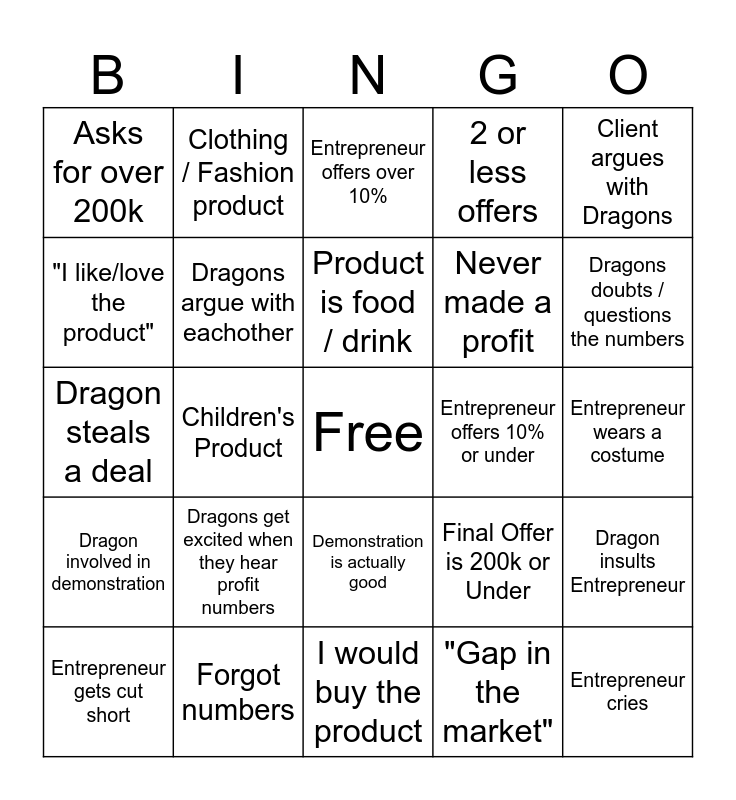 This bingo card has a free space and 59 words: Mentions Patents/IP, Forgot numbers, Mentions Social Media, Dragon involved in demonstration, "Gap in the market", Used to work in finance, Dragons argue with eachother, Made in china, Never made a profit, "I really like you .. But", 2 or less offers, 3 or more offers, "I like/love the product", Leaves The dragons to discuss aka "Talk to the wall", Asks for 200k or under, Asks for over 200k, Entrepreneur cries, Client argues with Dragons, No Offers, Product is food / drink, Entrepreneur offers 10% or under, Entrepreneur offers over 10%, Entrepreneur gets cut short, Dragon insults Entrepreneur, Product is a shitty ripoff, Cringe demonstration, Health product, "I cant quite tell what the business is..", Dragons doubts / questions the numbers, Dragons question the offer, Client sold house/car for business, Entrepreneur still has a "main career", "Keep doing what your doing", Offer is split among multiple dragons, Clothing / Fashion product, Product still exists today (google search it), Household product, Children's Product, Personal Care Product, Dragon steals a deal, Dragons laugh, Dragons get excited when they hear profit numbers, Entrepreneur wears a costume, Entrepreneur wears a suit / smart attire, Entrepreneur wears casual clothes, Product is borderline a scam, Trying to haggle equity under 5%, Entrepreneur has no sales, Demonstration is actually good, I would buy the product, I would not buy the product, "and for that reason I'm out", Entrepreneur doesn't even need the investment, One of the dragons is from the same place as the Entrepreneur, Entrepreneur visibly sweating, Final Offer is 200k or Under, Final Offer is Over 200k, Final Offer is 10% or under and Final Offer is over 10%.