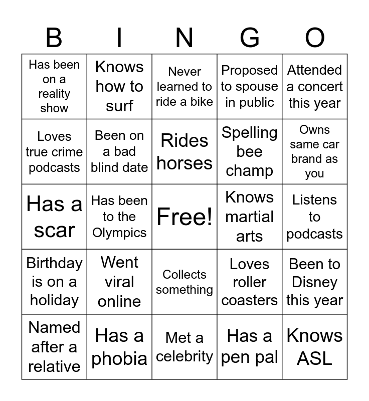 This bingo card has a free space and 50 words: Knows how to read tarot, Knows ASL, Appeared in a movie, Met a celebrity, Went viral online, Owns a gaming computer, Knows how to surf, Has an unusual family tradition, Loves true crime podcasts, Likes pineapple on pizza, Been on a bad blind date, Proposed to spouse in public, Been to Disney this year, Loves roller coasters, Does Yoga, Can do a cartwheel, Rides horses, Knows martial arts, Started a club, Attended a concert this year, Has been to the Olympics, Has a pen pal, Has been on a reality show, Spelling bee champ, Has been on a road trip, Same birth month as you, Owns same car brand as you, Never flown on an airplane, Never learned to ride a bike, Collects something, Goes all-out on holiday decorating, Recently handmade a gift, Received an award, Has performed in public, Has a phobia, Has a BFF from high school, Fostered or adopted a child, Currently a student, Took a how-to class recently, Listens to podcasts, Travels often, Attended high school reunion, Has food allergies, Belongs to a club, Named after a relative, Has a scar, Has broken a bone, Has a nickname, Birthday is on a holiday and Has a bucket list.