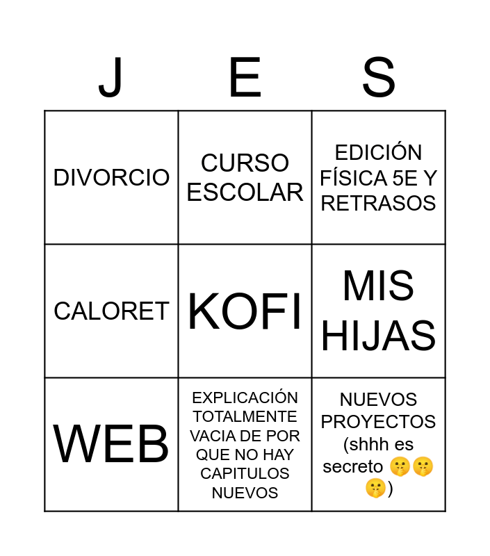 This bingo card has a free space and 8 words: MIS HIJAS, EDICIÓN FÍSICA 5E Y RETRASOS, CURSO ESCOLAR, WEB, DIVORCIO, NUEVOS PROYECTOS (shhh es secreto 🤫🤫🤫), CALORET and EXPLICACIÓN TOTALMENTE VACIA DE POR QUE NO HAY CAPITULOS NUEVOS.