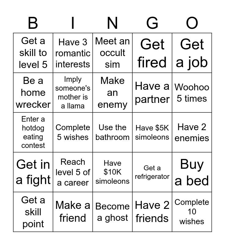 This bingo card has a free space and 24 words: Reach level 5 of a career, Make a friend, Make an enemy, Get a skill point, Get a job, Get a skill to level 5, Be a home wrecker, Have 3 romantic interests, Have $5K simoleons, Have $10K simoleons, Have a partner, Enter a hotdog eating contest, Get a refrigerator, Buy a bed, Imply someone's mother is a llama, Have 2 friends, Have 2 enemies, Meet an occult sim, Woohoo 5 times, Complete 5 wishes, Complete 10 wishes, Get in a fight, Get fired and Become a ghost.
