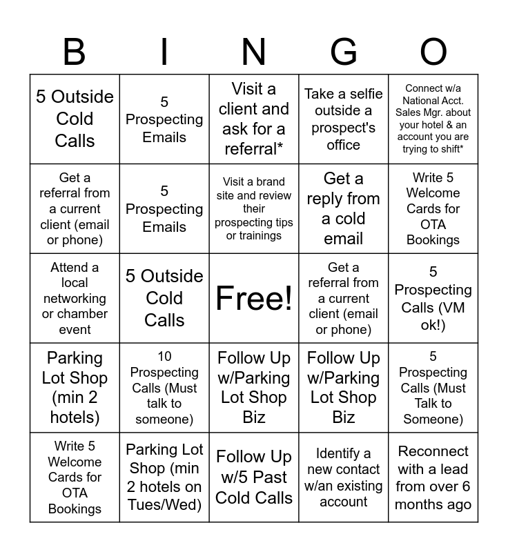 This bingo card has a free space and 24 words: 10 Prospecting Calls (Must talk to someone), Parking Lot Shop (min 2 hotels on Tues/Wed), Visit a brand site and review their prospecting tips or trainings, Write 5 Welcome Cards for OTA Bookings, Connect w/a National Acct. Sales Mgr. about your hotel & an account you are trying to shift*, 5 Outside Cold Calls, Get a referral from a current client (email or phone), 5 Prospecting Emails, Get a referral from a current client (email or phone), Follow Up w/Parking Lot Shop Biz, Get a reply from a cold email, Attend a local networking or chamber event, Follow Up w/Parking Lot Shop Biz, 5 Prospecting Calls (Must Talk to Someone), 5 Prospecting Emails, Identify a new contact w/an existing account, 5 Prospecting Calls (VM ok!), Visit a client and ask for a referral*, Write 5 Welcome Cards for OTA Bookings, 5 Outside Cold Calls, Reconnect with a lead from over 6 months ago, Parking Lot Shop (min 2 hotels), Take a selfie outside a prospect's office and Follow Up w/5 Past Cold Calls.