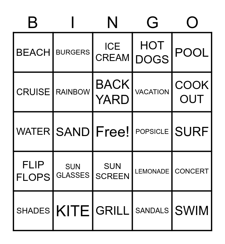 This bingo card has a free space and 29 words: SHADES, HOT, SAND, SHORTS, BEACH, ICE CREAM, RAINBOW, SUN GLASSES, POPSICLE, KITE, SURF, SWIM, GRILL, SANDALS, COOK OUT, TOWEL, SUN SCREEN, FLIP FLOPS, POOL, WATER, LEMONADE, BUGS, VACATION, CRUISE, HOT DOGS, BURGERS, CONCERT, BACK YARD and REUNION.