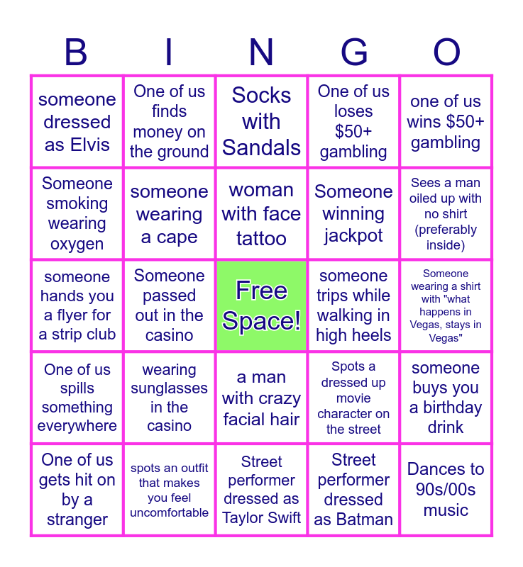 This bingo card has a free space and 24 words: wearing sunglasses in the casino, spots an outfit that makes you feel uncomfortable, woman with face tattoo, One of us gets hit on by a stranger, one of us wins $50+ gambling, someone dressed as Elvis, Someone smoking wearing oxygen, One of us finds money on the ground, someone trips while walking in high heels, a man with crazy facial hair, Someone winning jackpot, someone hands you a flyer for a strip club, Spots a dressed up movie character on the street, someone buys you a birthday drink, someone wearing a cape, Street performer dressed as Batman, Someone wearing a shirt with "what happens in Vegas, stays in Vegas", Socks with Sandals, Sees a man oiled up with no shirt (preferably inside), Someone passed out in the casino, Dances to 90s/00s music, One of us spills something everywhere, One of us loses $50+ gambling and Street performer dressed as Taylor Swift.