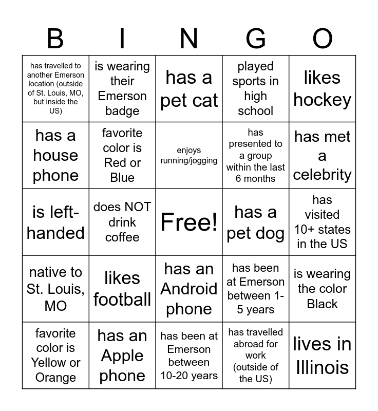 This bingo card has a free space and 51 words: likes pineapples of their pizza, lives in Illinois, has 2 or more children, has been at Emerson between 10-20 years, likes football, likes basketball, is wearing their Emerson badge, recycles, has a house phone, has been outside of the country, favorite color is Red or Blue, played sports in high school, is wearing the color Black, has been at Emerson between 1-5 years, favorite color is Black or Purple, sings karaoke, enjoys running/jogging, has a pet dog, has been at Emerson less than 1 year, likes hockey, does NOT drink coffee, has travelled abroad for work (outside of the US), has travelled to another Emerson location (outside of St. Louis, MO, but inside the US), has presented to a group within the last 6 months, has a Linked-In account, has cable TV, has met a celebrity, is a member of a book club, favorite color is Yellow or Orange, has a pet cat, prefers tea over coffee, celebrating a birthday this month, speaks 2 or more languages (English included), has a nickname, has been at Emerson between 5-10 years, has an Apple phone, takes daily walks, loves holiday decorating, graduated from a college NOT in Missouri, not originally from Missouri, has visited 10+ states in the US, native to St. Louis, MO, likes soccer, has taken more than 3 vacation days this year, works through their lunch hour, hangs out with co-workers outside of work, is left-handed, favorite color is Green or Pink, likes baseball, has an Android phone and graduated from a college in Missouri.