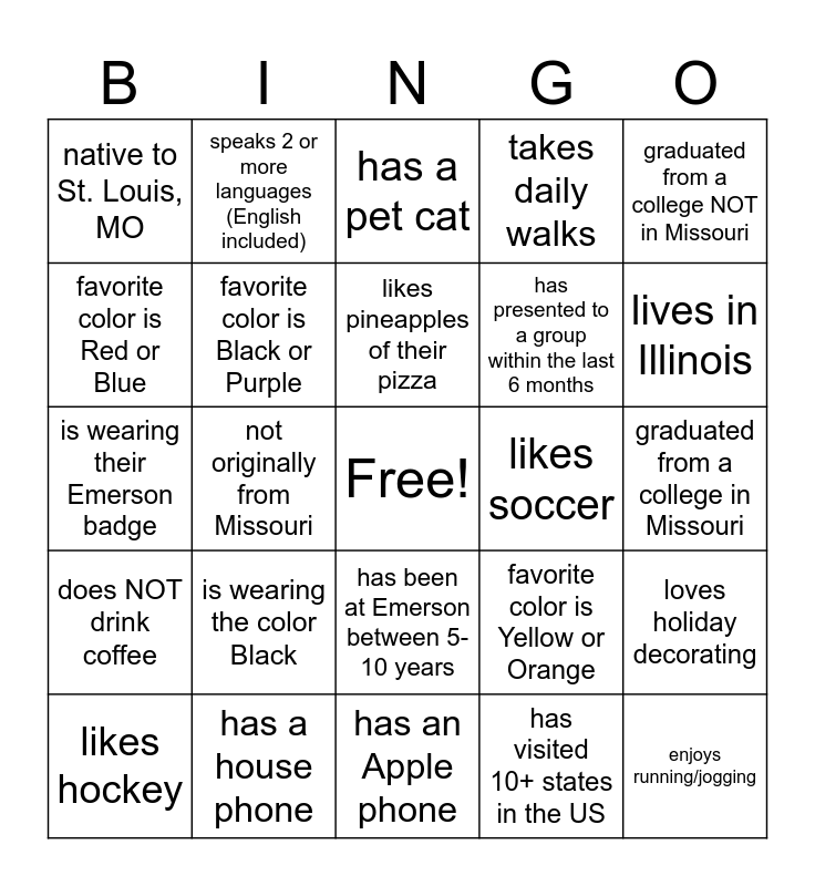 This bingo card has a free space and 51 words: sings karaoke, enjoys running/jogging, has a pet dog, has an Apple phone, is wearing the color Black, has been at Emerson between 1-5 years, speaks 2 or more languages (English included), has a nickname, favorite color is Red or Blue, played sports in high school, favorite color is Black or Purple, takes daily walks, loves holiday decorating, favorite color is Yellow or Orange, has 2 or more children, has been at Emerson between 10-20 years, likes pineapples of their pizza, likes soccer, has taken more than 3 vacation days this year, graduated from a college NOT in Missouri, not originally from Missouri, has visited 10+ states in the US, native to St. Louis, MO, has presented to a group within the last 6 months, has a Linked-In account, has cable TV, lives in Illinois, has travelled abroad for work (outside of the US), likes hockey, has a pet cat, prefers tea over coffee, celebrating a birthday this month, has travelled to another Emerson location (outside of St. Louis, MO, but inside the US), likes football, recycles, has a house phone, is left-handed, favorite color is Green or Pink, likes baseball, has an Android phone, graduated from a college in Missouri, does NOT drink coffee, has been outside of the country, works through their lunch hour, hangs out with co-workers outside of work, likes basketball, is wearing their Emerson badge, has met a celebrity, has been at Emerson less than 1 year, has been at Emerson between 5-10 years and is a member of a book club.