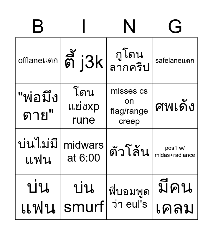 This bingo card has 16 words: บ่น smurf, pos1 w/ midas+radiance, กูโดนลากครีป, offlaneแตก, บ่นไม่มีแฟน, ตี้ j3k, ตัวโล้น, พี่บอมพูดว่า eul's, "พ่อมึงตาย", โดนแย่งxp rune, บ่นแฟน, safelaneแตก, midwars at 6:00, ศพเด้ง, misses cs on flag/range creep and มีคนเคลม.
