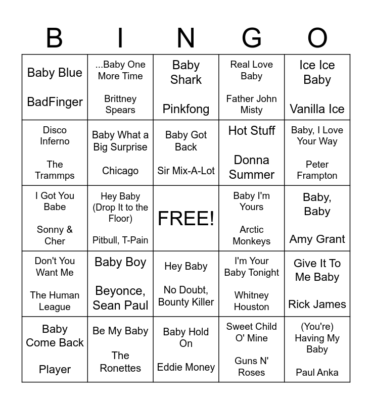 This bingo card has a free space and 34 words: Baby Justin Bieber, Sweet Child O' Mine Guns N' Roses, Bye Bye Bye *NSYNC, Santa Baby Eartha Kitt, Don't You Want Me The Human League, Baby What a Big Surprise Chicago, Ice Ice Baby Vanilla Ice, Baby Come Back Player, ...Baby One More Time Brittney Spears, Baby Love The Supremes, Baby Got Back Sir Mix-A-Lot, Baby Shark Pinkfong, Can't Get Enough Of You Baby Smash Mouth, Baby I Need Your Loving Four Tops, Baby I'm Yours Arctic Monkeys, Baby, I Love Your Way Peter Frampton, Be My Baby The Ronettes, I Got You Babe Sonny & Cher, Baby Boy Beyonce, Sean Paul, I'm Your Baby Tonight Whitney Houston, Hey Baby No Doubt, Bounty Killer, Don't Worry Baby The Beach Boys, Baby Blue BadFinger, Baby, Baby Amy Grant, Baby Hold On Eddie Money, (You're) Having My Baby Paul Anka, Real Love Baby Father John Misty, ... Come on Over Christina Aguilera, Hot Stuff Donna Summer, Disco Inferno The Trammps, Always Be My Baby Mariah Carey, Hey Baby (Drop It to the Floor) Pitbull, T-Pain, Give It To Me Baby Rick James and Runaway Baby Bruno Mars.