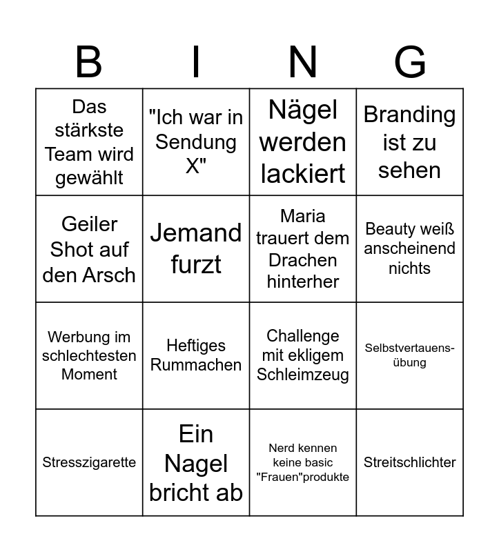 This bingo card has 16 words: Ein Nagel bricht ab, Selbstvertauens- übung, Nägel werden lackiert, Das stärkste Team wird gewählt, Werbung im schlechtesten Moment, "Ich war in Sendung X", Challenge mit ekligem Schleimzeug, Nerd kennen keine basic "Frauen"produkte, Geiler Shot auf den Arsch, Jemand furzt, Stresszigarette, Branding ist zu sehen, Heftiges Rummachen, Beauty weiß anscheinend nichts, Maria trauert dem Drachen hinterher and Streitschlichter.