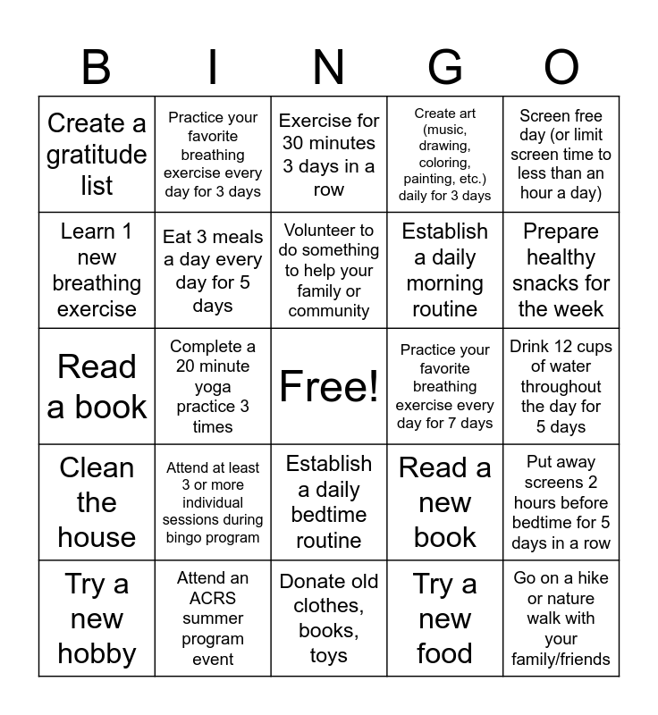This bingo card has a free space and 24 words: Attend at least 3 or more individual sessions during bingo program, Attend an ACRS summer program event, Volunteer to do something to help your family or community, Try a new hobby, Screen free day (or limit screen time to less than an hour a day), Create a gratitude list, Learn 1 new breathing exercise, Practice your favorite breathing exercise every day for 3 days, Practice your favorite breathing exercise every day for 7 days, Establish a daily bedtime routine, Establish a daily morning routine, Read a book, Read a new book, Put away screens 2 hours before bedtime for 5 days in a row, Eat 3 meals a day every day for 5 days, Try a new food, Drink 12 cups of water throughout the day for 5 days, Exercise for 30 minutes 3 days in a row, Prepare healthy snacks for the week, Complete a 20 minute yoga practice 3 times, Go on a hike or nature walk with your family/friends, Clean the house, Create art (music, drawing, coloring, painting, etc.) daily for 3 days and Donate old clothes, books, toys.