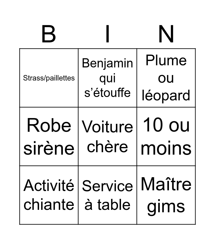 This bingo card has a free space and 8 words: 10 ou moins, Plume ou léopard, Benjamin qui s’étouffe, Activité chiante, Strass/paillettes, Maître gims, Robe sirène and Service à table.