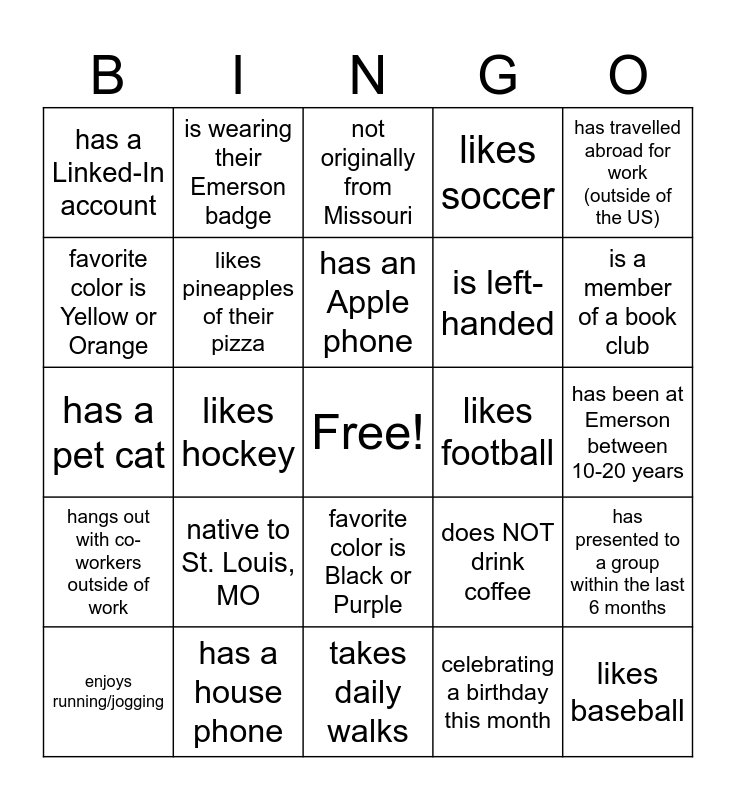 This bingo card has a free space and 51 words: favorite color is Green or Pink, likes baseball, has an Android phone, takes daily walks, native to St. Louis, MO, sings karaoke, is wearing their Emerson badge, has met a celebrity, favorite color is Yellow or Orange, has visited 10+ states in the US, likes pineapples of their pizza, likes soccer, has presented to a group within the last 6 months, does NOT drink coffee, works through their lunch hour, has been outside of the country, has an Apple phone, likes football, lives in Illinois, has travelled abroad for work (outside of the US), likes hockey, celebrating a birthday this month, has a Linked-In account, is left-handed, loves holiday decorating, graduated from a college NOT in Missouri, is a member of a book club, has cable TV, enjoys running/jogging, not originally from Missouri, has been at Emerson less than 1 year, favorite color is Red or Blue, has taken more than 3 vacation days this year, is wearing the color Black, has travelled to another Emerson location (outside of St. Louis, MO, but inside the US), has a house phone, has a nickname, has been at Emerson between 1-5 years, has a pet dog, has 2 or more children, has been at Emerson between 10-20 years, hangs out with co-workers outside of work, likes basketball, graduated from a college in Missouri, speaks 2 or more languages (English included), recycles, has a pet cat, prefers tea over coffee, played sports in high school, favorite color is Black or Purple and has been at Emerson between 5-10 years.