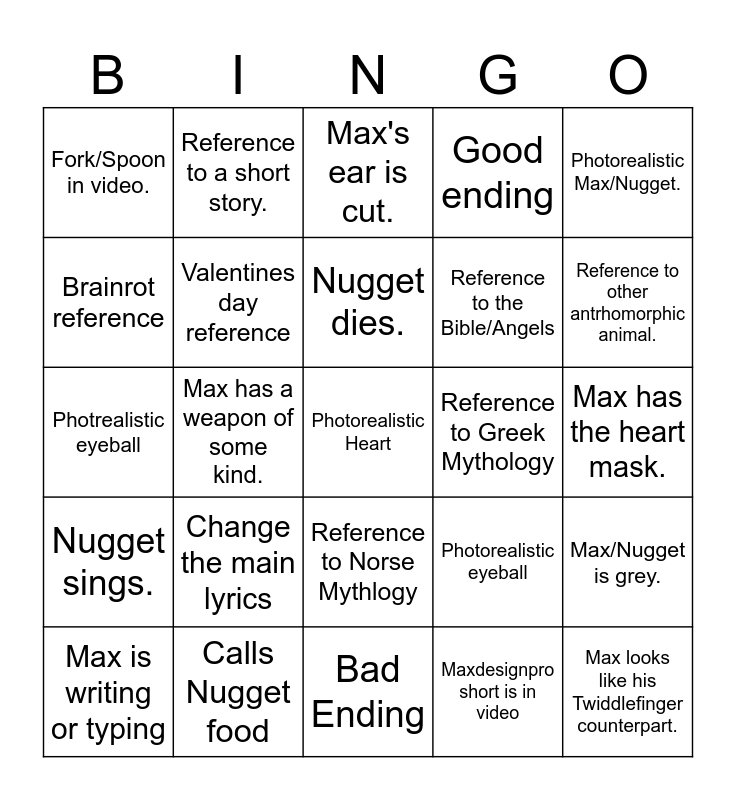 This bingo card has a free space and 24 words: Change the main lyrics, Calls Nugget food, Nugget dies., Max is writing or typing, Photorealistic Max/Nugget., Fork/Spoon in video., Brainrot reference, Reference to a short story., Reference to Greek Mythology, Reference to Norse Mythlogy, Reference to the Bible/Angels, Photrealistic eyeball, Photorealistic eyeball, Max/Nugget is grey., Valentines day reference, Maxdesignpro short is in video, Max has the heart mask., Max's ear is cut., Reference to other antrhomorphic animal., Max has a weapon of some kind., Max looks like his Twiddlefinger counterpart., Nugget sings., Good ending and Bad Ending.