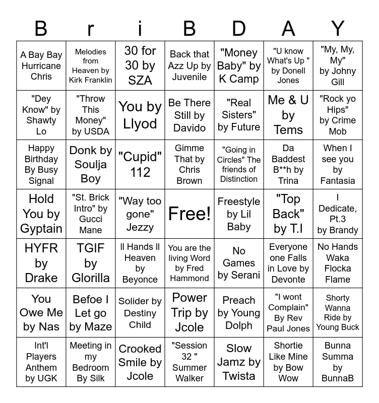 This bingo card has a free space and 48 words: Preach by Young Dolph, Me & U by Tems, "Session 32 " Summer Walker, "St. Brick Intro" by Gucci Mane, "Cupid" 112, I Dedicate, Pt.3 by Brandy, Melodies from Heaven by Kirk Franklin, Meeting in my Bedroom By Silk, "U know What's Up " by Donell Jones, You are the living Word by Fred Hammond, "My, My, My" by Johny Gill, Back that Azz Up by Juvenile, Da Baddest B**h by Trina, "Going in Circles" The friends of Distinction, You Owe Me by Nas, "Top Back" by T.I, "Dey Know" by Shawty Lo, "Rock yo Hips" by Crime Mob, "I wont Complain" By Rev Paul Jones, "Money Baby" by K Camp, "Real Sisters" by Future, "Way too gone" Jezzy, A Bay Bay Hurricane Chris, "Throw This Money" by USDA, Shorty Wanna Ride by Young Buck, You by Llyod, When I see you by Fantasia, Int'l Players Anthem by UGK, Gimme That by Chris Brown, Donk by Soulja Boy, Shortie Like Mine by Bow Wow, Freestyle by Lil Baby, No Hands Waka Flocka Flame, Befoe I Let go by Maze, Hold You by Gyptain, No Games by Serani, Everyone one Falls in Love by Devonte, Happy Birthday By Busy Signal, ll Hands ll Heaven by Beyonce, Solider by Destiny Child, HYFR by Drake, Bunna Summa by BunnaB, 30 for 30 by SZA, Crooked Smile by Jcole, Be There Still by Davido, Power Trip by Jcole, TGIF by Glorilla and Slow Jamz by Twista.