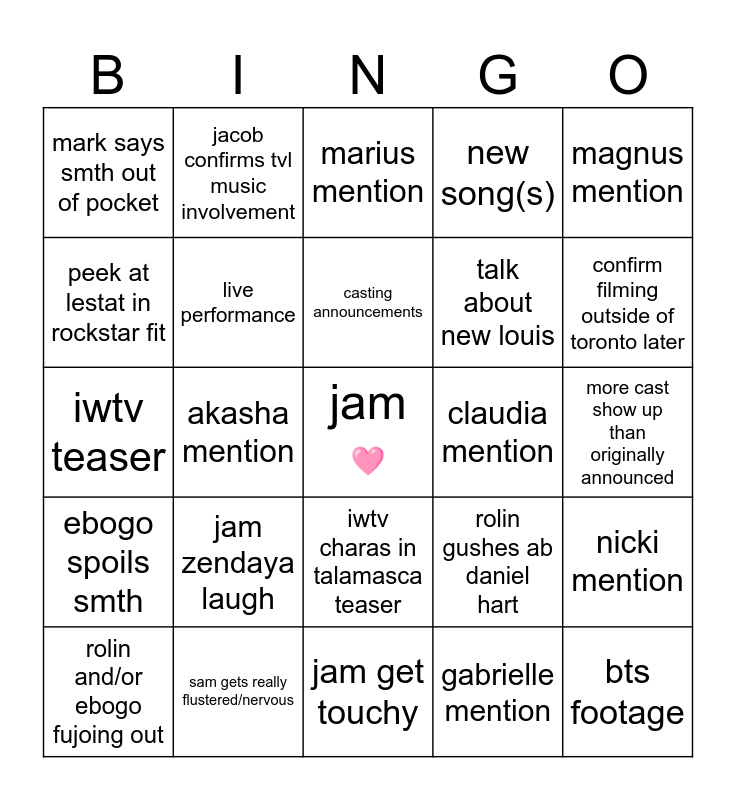 This bingo card has a free space and 24 words: jam zendaya laugh, sam gets really flustered/nervous, casting announcements, rolin and/or ebogo fujoing out, magnus mention, mark says smth out of pocket, peek at lestat in rockstar fit, jacob confirms tvl music involvement, claudia mention, iwtv charas in talamasca teaser, talk about new louis, iwtv teaser, rolin gushes ab daniel hart, nicki mention, live performance, gabrielle mention, more cast show up than originally announced, marius mention, confirm filming outside of toronto later, akasha mention, bts footage, ebogo spoils smth, new song(s) and jam get touchy.