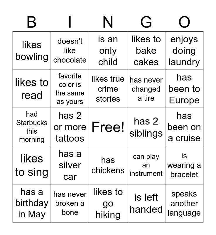 This bingo card has a free space and 29 words: has a birthday in May, has had braces, has 2 or more tattoos, has never been on a plane, likes bowling, is an only child, favorite color is the same as yours, has a silver car, has 2 siblings, has never broken a bone, has been on a cruise, speaks another language, likes to go hiking, is left handed, has been to Europe, has 2 children, has chickens, likes to sing, enjoys doing laundry, had Starbucks this morning, can play an instrument, has 3 dogs, has never changed a tire, likes to read, likes to bake cakes, doesn't like chocolate, is wearing a bracelet, likes true crime stories and has rode a horse.