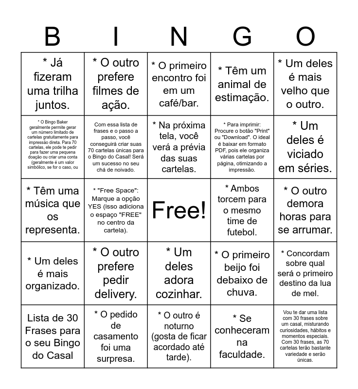 This bingo card has a free space and 45 words: Ótimo! Setenta cartelas é um número considerável, e como você não tem a lista de frases, eu vou criar uma bem variada e divertida para você., Vou te dar uma lista com 30 frases sobre um casal, misturando curiosidades, hábitos e momentos especiais. Com 30 frases, as 70 cartelas terão bastante variedade e serão únicas., Depois de te dar as frases, vou te explicar o passo a passo de como usar uma ferramenta online (como o Bingo Baker, que é excelente para isso) para gerar todas as 70 cartelas de forma fácil e rápida, prontas para imprimir., Lista de 30 Frases para o seu Bingo do Casal, Aqui estão as frases que você pode usar:, * Se conheceram na faculdade., * O primeiro encontro foi em um café/bar., * Já viajaram para fora do Brasil juntos., * Um deles é mais velho que o outro., * O pedido de casamento foi uma surpresa., * Têm um animal de estimação., * Ambos torcem para o mesmo time de futebol., * Um deles adora cozinhar., * O outro prefere pedir delivery., * Um deles acorda mais cedo., * O outro é noturno (gosta de ficar acordado até tarde)., * Ambos gostam de café., * Têm uma música que os representa., * Já moraram em cidades diferentes., * Um deles é viciado em séries., * O outro prefere filmes de ação., * Um deles tem um talento secreto (ex: cantar, tocar instrumento)., * O outro é apaixonado por plantas., * Já fizeram uma trilha juntos., * Um deles sempre perde as chaves., * O outro demora horas para se arrumar., * Um deles ronca mais alto., * Já se perderam em uma viagem., * O primeiro beijo foi debaixo de chuva., * Um deles é mais organizado., * O outro é mais bagunceiro., * Concordam sobre qual será o primeiro destino da lua de mel., * Já cozinharam uma refeição romântica, * Configure as Opções:, * "Board Size": Mantenha em 5x5 (é o padrão para bingo)., * "Free Space": Marque a opção YES (isso adiciona o espaço "FREE" no centro da cartela)., * "Header Text": Você pode personalizar o título da cartela. Sugestões: "Bingo do Amor de [Nome do Noivo] e [Nome da Noiva]", ou "Bingo do Chá de Noivado"., * Gere as Cartelas: Clique no botão verde "Generate Bingo Cards"., * Visualize e Baixe/Imprima:, * Na próxima tela, você verá a prévia das suas cartelas., * O Bingo Baker geralmente permite gerar um número limitado de cartelas gratuitamente para impressão direta. Para 70 cartelas, ele pode te pedir para fazer uma pequena doação ou criar uma conta (geralmente é um valor simbólico, se for o caso, ou, * Para imprimir: Procure o botão "Print" ou "Download". O ideal é baixar em formato PDF, pois ele organiza várias cartelas por página, otimizando a impressão., * Você pode ajustar o "Theme" (tema) para mudar as cores e o estilo das cartelas, se quiser algo mais personalizado., Com essa lista de frases e o passo a passo, você conseguirá criar suas 70 cartelas únicas para o Bingo do Casal! Será um sucesso no seu chá de noivado. and Me diga se tiver qualquer dificuldade ou se precisar de mais alguma ajuda!.