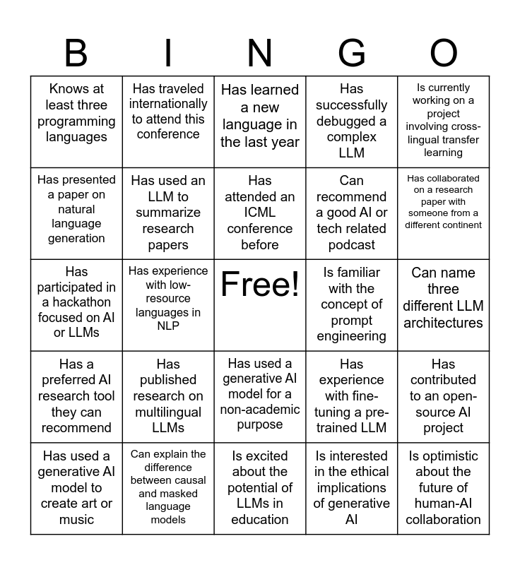 This bingo card has a free space and 24 words: Has published research on multilingual LLMs, Can explain the difference between causal and masked language models, Has attended an ICML conference before, Has used a generative AI model to create art or music, Is currently working on a project involving cross-lingual transfer learning, Knows at least three programming languages, Has presented a paper on natural language generation, Has traveled internationally to attend this conference, Is familiar with the concept of prompt engineering, Has used a generative AI model for a non-academic purpose, Can recommend a good AI or tech related podcast, Has participated in a hackathon focused on AI or LLMs, Has experience with fine-tuning a pre-trained LLM, Has contributed to an open-source AI project, Has used an LLM to summarize research papers, Is interested in the ethical implications of generative AI, Can name three different LLM architectures, Has learned a new language in the last year, Has collaborated on a research paper with someone from a different continent, Has experience with low-resource languages in NLP, Is optimistic about the future of human-AI collaboration, Has a preferred AI research tool they can recommend, Has successfully debugged a complex LLM and Is excited about the potential of LLMs in education.