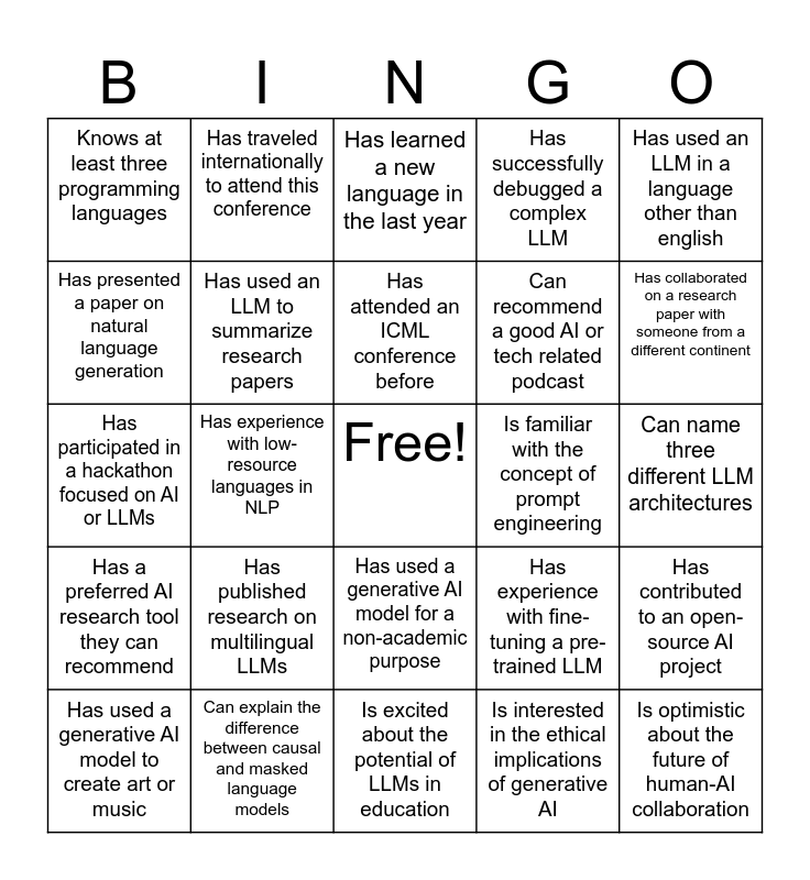 This bingo card has a free space and 24 words: Has published research on multilingual LLMs, Can explain the difference between causal and masked language models, Has attended an ICML conference before, Has used a generative AI model to create art or music, Has used an LLM in a language other than english, Knows at least three programming languages, Has presented a paper on natural language generation, Has traveled internationally to attend this conference, Is familiar with the concept of prompt engineering, Has used a generative AI model for a non-academic purpose, Can recommend a good AI or tech related podcast, Has participated in a hackathon focused on AI or LLMs, Has experience with fine-tuning a pre-trained LLM, Has contributed to an open-source AI project, Has used an LLM to summarize research papers, Is interested in the ethical implications of generative AI, Can name three different LLM architectures, Has learned a new language in the last year, Has collaborated on a research paper with someone from a different continent, Has experience with low-resource languages in NLP, Is optimistic about the future of human-AI collaboration, Has a preferred AI research tool they can recommend, Has successfully debugged a complex LLM and Is excited about the potential of LLMs in education.