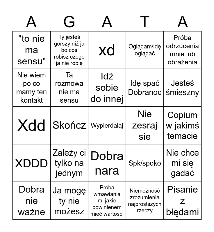 Agata bingo | Siusta bingo | Potworek Bingo | Marlena bingo | Jakub Bingo