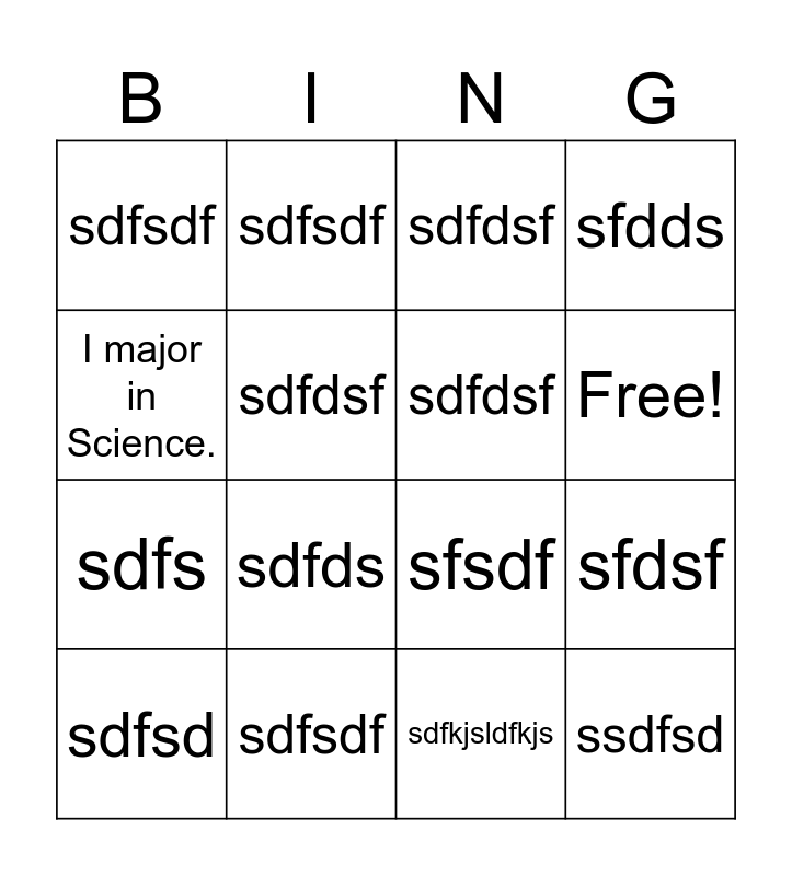 This bingo card has 17 words: sdfkjsldfkjs, sdfsd, sdfdsf, sdfsdf, sdfds, sfdds, sfdsf, sdfdsf, Free!, sdfdsf, sdfsdf, sfsdf, I major in Science., sdfsdf, sdfs, sdfsd and ssdfsd.