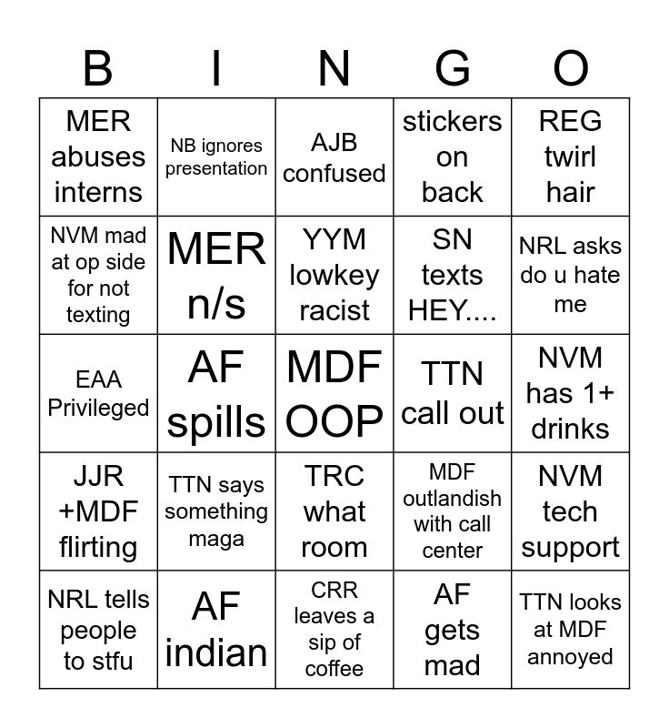 This bingo card has a free space and 34 words: JJR crash out, AF gets mad, TTN goes in pt room alone, We lose YYM, JJR +MDF flirting, MER n/s, REG twirl hair, NRL tells people to stfu, NB ignores presentation, MDF makes new ppl uncomfy, YYM lowkey racist, AJB confused, JJR thirsting over girls, MDF breaks into song, TTN call out, NRL asks do u hate me, AF indian, EAA Privileged, TTN says something maga, MDF outlandish with call center, TRC what room, EAA distracts MAs, MER abuses interns, NVM has 1+ drinks, CRR leaves a sip of coffee, TTN looks at MDF annoyed, stickers on back, AJB makes face, SN texts HEY...., NVM mad at op side for not texting, NVM here until 6, AF spills, NVM tech support and AF mean.