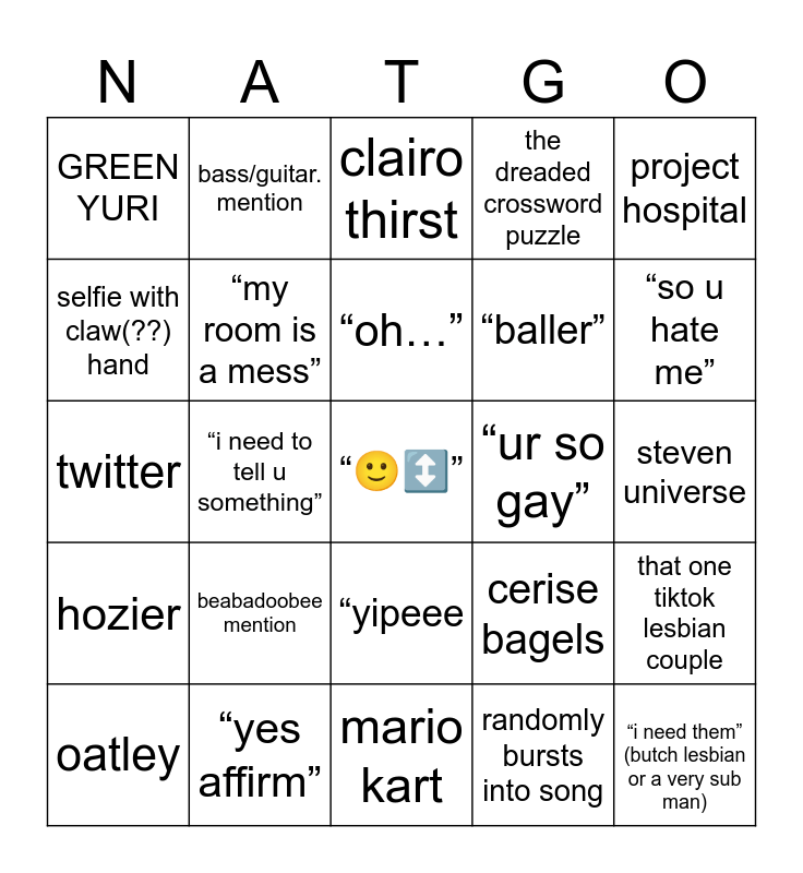 This bingo card has a free space and 24 words: beabadoobee mention, “yes affirm”, “oh…”, oatley, project hospital, GREEN YURI, selfie with claw(??) hand, bass/guitar. mention, “ur so gay”, “yipeee, “baller”, twitter, cerise bagels, that one tiktok lesbian couple, “my room is a mess”, randomly bursts into song, steven universe, clairo thirst, “so u hate me”, “i need to tell u something”, “i need them” (butch lesbian or a very sub man), hozier, the dreaded crossword puzzle and mario kart.